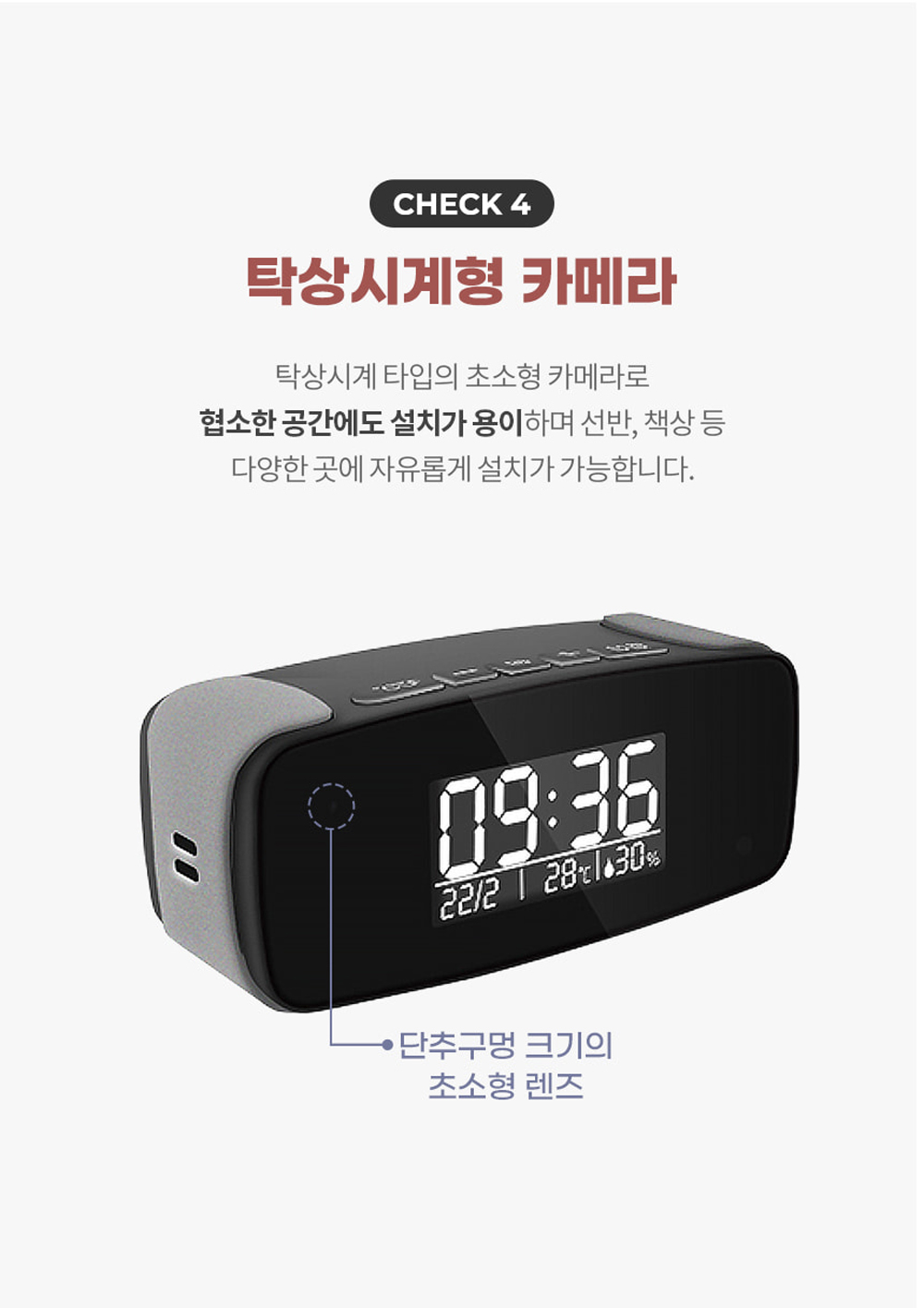탁상시계나 소품처럼 위장되어 설치해도 자연스럽습니다.