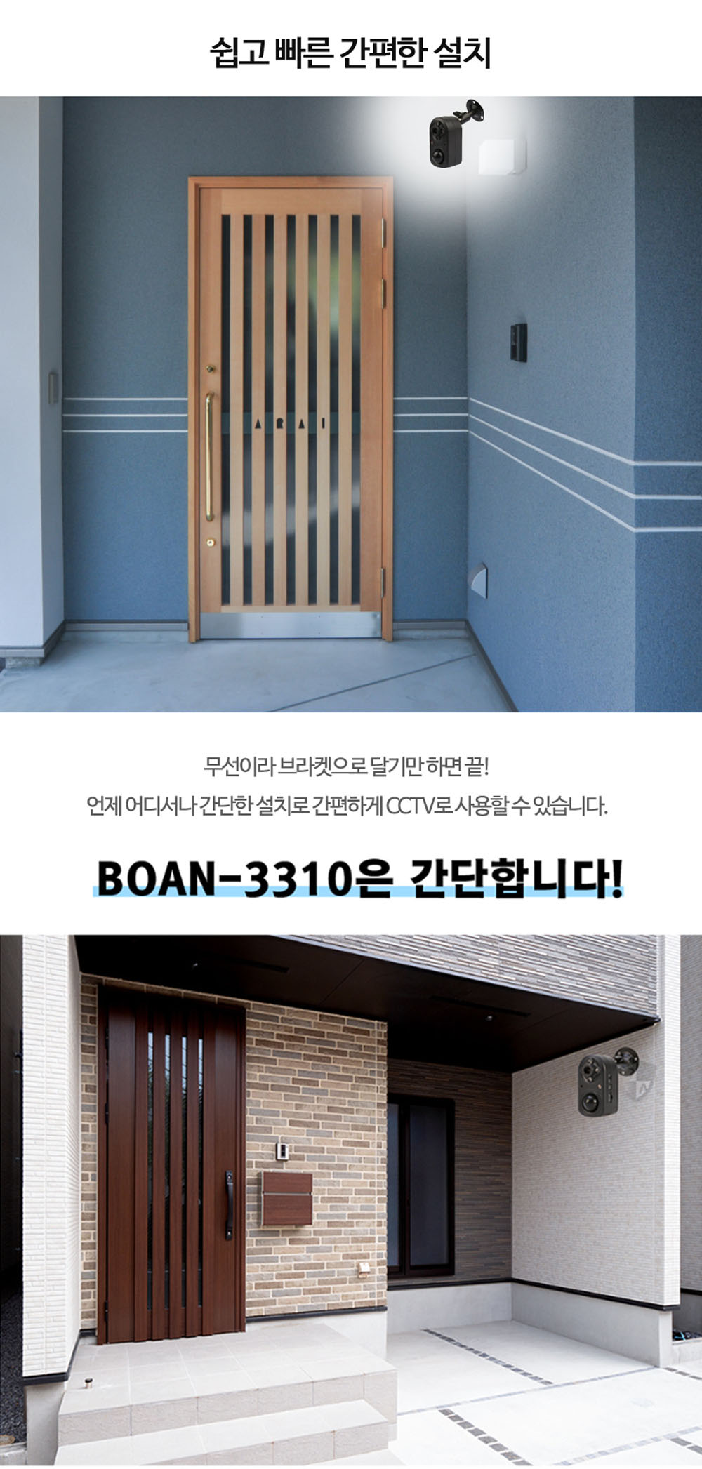 BOAN-3310은 간편설치보안카메라 구조 덕분에 시공 비용 없이 직접 설치가 가능해 부담을 줄여줍니다.