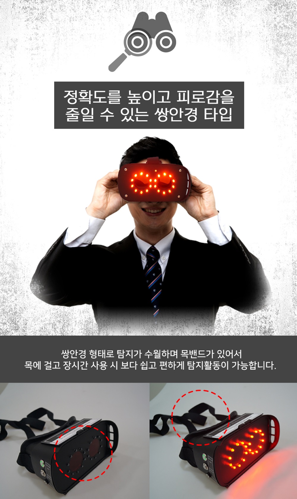 특히, 쌍안경 형태의 독창적인 디자인은 사용 중 눈의 피로를 줄이고 집중력을 높여 오랜 시간 탐지 작업도 수월하게 진행할 수 있도록 도와줍니다.
