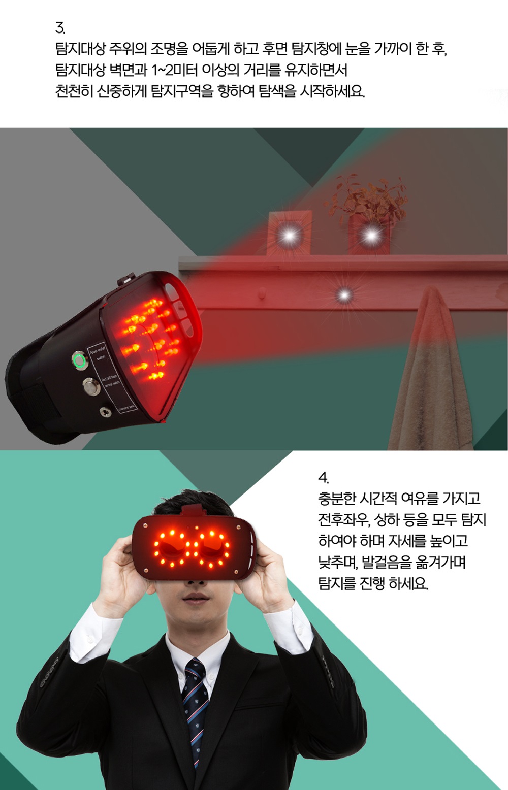 전원을 켜고 탐지 대상 주변 조명을 어둡게 한 후, 탐지창을 통해 약 1~2m 거리에서 렌즈의 반사광을 확인하기만 하면 됩니다. 탐지가 끝난 뒤 전원을 꺼 안전하게 보관하면 모든 과정이 완료됩니다.