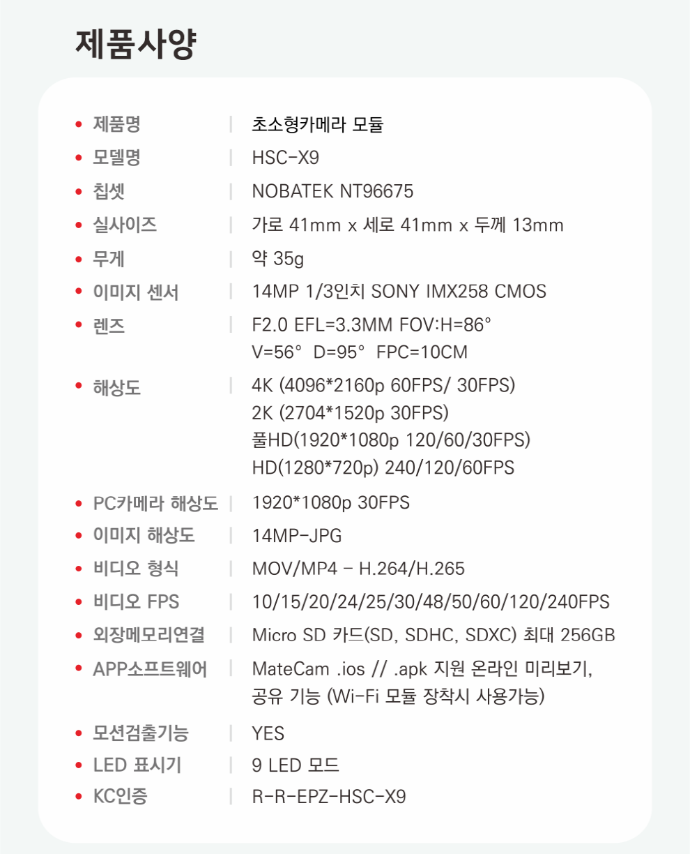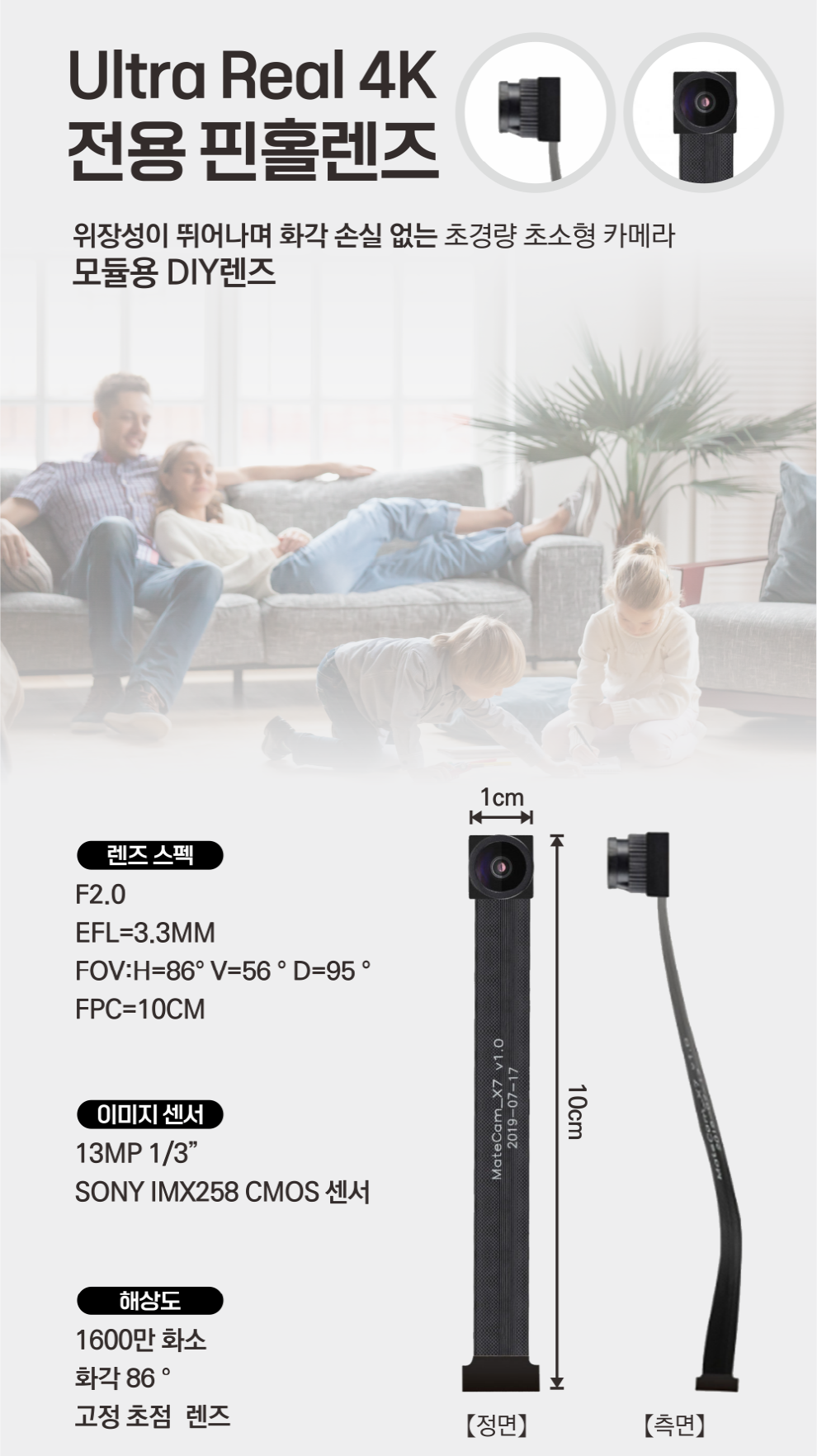 렌즈는 초소형 핀홀 설계로 위장성과 휴대성을 극대화하며, 기본 86° 화각을 지원합니다.